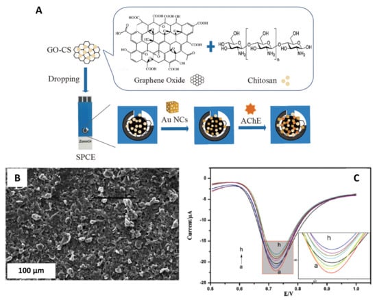 Yao et al. [] developed a new biosensor to detect chlorpyrifos, an extensively used organophosphate pesticide in agriculture []. Firstly, a nanocomposite was constructed of graphene oxide (GO), chitosan (CS), and the AuNCs. Secondly, the acetylcholinesterase (AChE) enzyme was immobilized in the previous matrix and was used to modify a screen-printed electrode. Finally, the constructed biosensor AuNCs/GO-CS/AChE/SPCE (Figure 11A) had good sensitivity towards detecting acetylthiocholine chloride (ATCl) and pesticides.