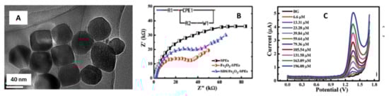 Several investigations include the synthesis of nanoparticles with a spherical shape. These NPs have been used to modify SPEs with different applicability in numerous fields. Singh et al. [] prepared a graphene oxide-cyclodextrin composite with platinum nanoparticles (GR/CD/Pt). This nanocomposite was incorporated into the SPEs by printing it upon the working electrode’s top, obtaining the GR/CD/Pt/SPE, further used for cysteine determination. The modified SPE were characterized by employing scanning electron microscopy (SEM), transmission electron microscopy (TEM), atomic force microscopy (AFM), Fourier transform infrared (FT-IR), and thermogravimetric analysis (TGA). Figure 2A shows a TEM image of the GR/CD/Pt with spherical-shaped particle structure. A coating of platinum NPs over GR/CD composite with an average diameter of 15 nm can be observed.