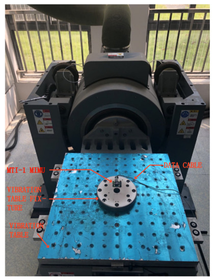 In order to obtain the output data of MIMU under the vibration environment, the following random vibration test was designed. The power spectrum density and frequency range of the vibration are as shown in the Figure 1. The experimental platform is shown in Figure 2, which is composed of a MIMU (MTI-1 from the XSENS company), a vibration table, and the tooling for the vibration table. The specification of the MIMU is listed in Table 1.