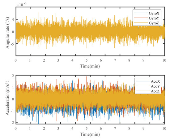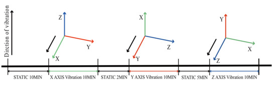 Since the MTI-1 MIMU cannot be sensitive to the Earth’s rotation angular rate, its gyro output under static conditions can be regarded as zero bias and random noise. Vibration noise can be obtained by subtracting the average value of the data at rest when the vibration table is turned on. Thus, the process of the experiment was arranged as in Figure 3 to obtain both the static output and the vibration output of the three axes. The processed vibration noise data in the experiment are shown in Figure 4.