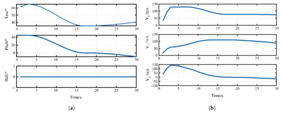 The real-time trajectory of the simulation. (a) The real-time attitude of the simulated trajectory. (b) The real-time velocity of the simulated trajectory in the direction of east, north, and up, respectively.