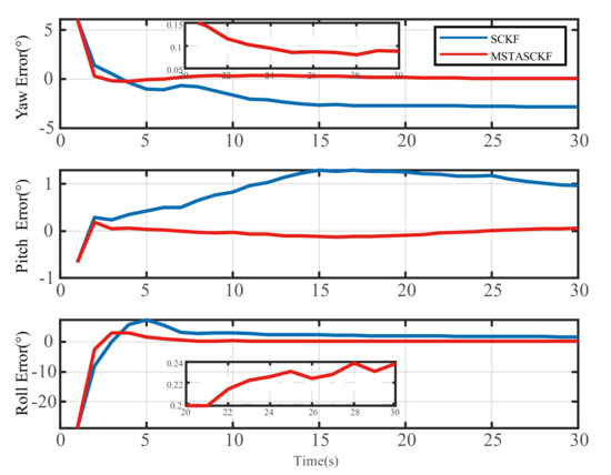 The figure shows that the MSTASCKF has an advantage in convergence speed in the alignment process. The estimation of yaw, pitch, and roll converged within 15 s and finally reached the accuracy of 0.08°, 0.05°, and 0.25°, respectively. The SCKF had a worse performance, which can be easily observed as it converged slower and only met the accuracy of −2.85°, 0.95°, 1.65° for the yaw, pitch, and roll under the vibration noise.