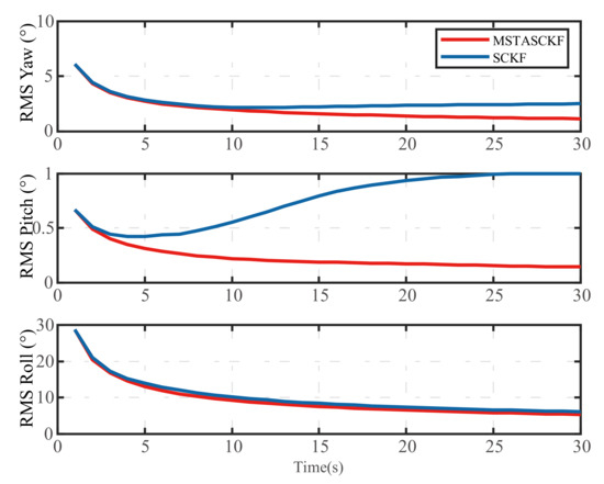 We can see that the proposed method had a better RMS performance than the SCKF. The RMS values of the three attitudes of MSTASCKF and SCKF at the end of the alignment process were and , respectively. The RMS of the yaw and roll was much larger than the pitch. This was caused by the estimation scheme, since the MSTASCKF and SCKF had the same trend. The first estimation of roll and pitch had such a large deviation that the subsequent RMS value was affected.