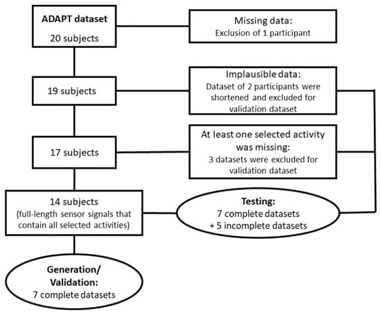 Data of 14 participants included the activities of walking, ascending and descending stairs. Seven of them were randomly selected and used to extract a reference template database as well as for the development and validation of the activity recognition algorithm using DTW. The remaining 12 datasets were used to test the algorithm. The selection and allocation process is shown in Figure 1.