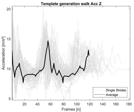 Overlay of walking stride snippets and the resulting average template calculated by the dynamic time warping (DTW) averaging method [].