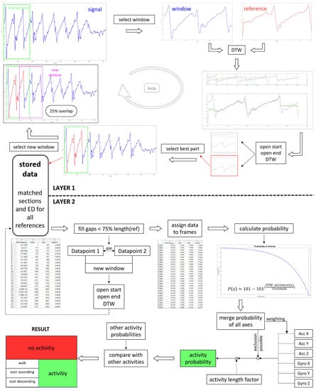 Various signal processing and classification techniques have been employed to recognize different types of human activities with high accuracy, such as hidden Markov models (HMM), principle component analysis (PCA), support vector machines (SVM), linear discriminant analysis (LDA) and artificial neural networks (ANN) []. Although human activity recognition can be successfully achieved using wearable sensors with accuracy rates up to 94%, it is still very challenging to differentiate different types of locomotion []. Some activities, such as walking and climbing stairs, are more difficult to identify because of the high similarity between them. As human locomotion is periodic, in most cases a patter-based approach seems to be most suitable. Due to high variability in the timing and expression of a movement sequence within each specific locomotion event, a more robust method is needed that allows a non-linear shift in time series to hold valid for sections that are similar but out of phase. For example, single strides always look quite similar regarding the overall pattern, but duration, amplitudes and timing of gait events are not identical. Ideally, the method should not require a huge amount of data to train the algorithm. In this paper, we focus on dynamic time warping (DTW), which enables the comparison and detection of similarity between two temporal sequences that vary in speed and timing by allowing an elastic shift of the time axis []. The DTW algorithm compensates temporal differences between sensor signals by stretching the two vectors non-linearly in order to minimize the sum of the Euclidean distances (ED) between the corresponding points.