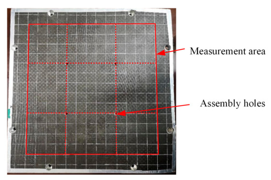 The test specimen in the experiment was a 300 mm × 300 mm × 15 mm carbon-fiber aluminum honeycomb sandwich panel with assembly holes which was produced as a wall or wing panel for a microsatellite. The upper and lower surface layers of the sandwich panel were made of T700/AG80 carbon-fiber plies with a thickness of 1 mm. The honeycomb core was a hexagonal aluminum honeycomb core with a wall thickness of 0.3 mm. A photograph of the specimen is shown in Figure 1.