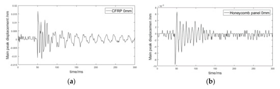 To illustrate further the impact response characteristics of the sandwich panel, a 300 mm × 300 mm × 2.1 mm CFRP laminate was used as the control specimen. The two specimens were loaded with the same impacts, which were from FBG1 0 mm and 200 mm respectively, and the recorded time–domain signals are shown in Figure 4.