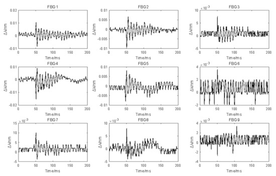 Time-domain response signals of the impact (−81 mm, 81 mm) measured by the nine FBG sensors.