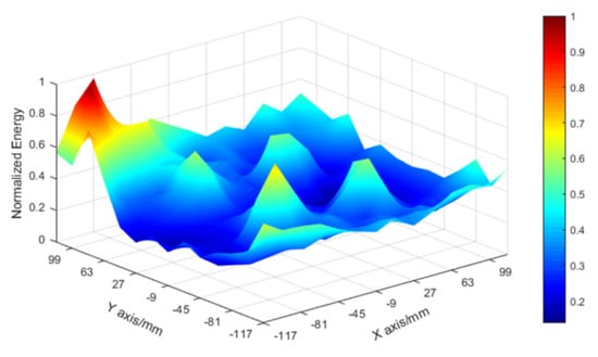 Figure 5 shows that FBG1, FBG2, FBG4, and FBG5 measured clearer time–domain waveforms, whereas FBG6, FBG8, and FBG9, which were far from the impact position, had almost no clear waveforms in their measured response signals. Signals such as the latter, whether used for training or testing, may have a negative effect on the positioning algorithm. Next, each grid intersection in the measurement area was impact loaded, the signal energy measured by FBG1 was calculated and normalized, and the resulting energy contour map is shown in Figure 6. As can be seen, the energy of the response signal decreased with increasing distance between the sensor and the impact. Obviously, higher signal energy means better signal quality.
