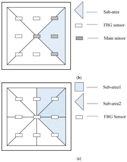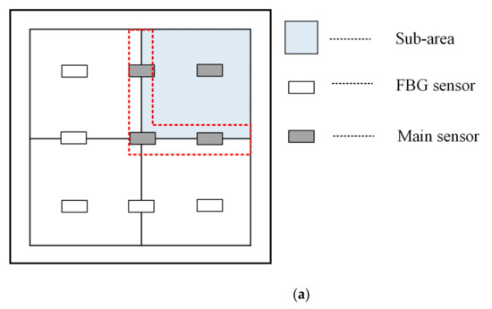 As shown in Figure 7a, FBG2, FBG3, FBG5, and FBG6 were selected as the main sensors, which were given a higher weight in classification. In Figure 7b, FBG3, FBG5, FBG6, and FBG9 were selected as the main sensors. In the actual experiment process, when the impact loaded close to the boundary of the sub-area, as shown in the red dashed box in Figure 7a, the sub-area is easy to be judged incorrectly. Improper main sensors and a sub-classifier were selected, which caused massive location errors. This situation can be avoided by combining the division modes in Figure 7a,b, which was shown in Figure 7c. The measurement area was divided into eight triangular sub-blocks. Two adjacent triangular sub-blocks were assembled into a measurement sub-area (sub-areas 1 and 2 are shown in Figure 7a), giving a total of eight sub-areas. This division and combination form has overlap and redundancy, but it is effective at preventing the impact signal from falling at the junction of the two sub-areas. The four FBGs in each sub-area are the main sensors, and the five FBGs outside the sub-area are the auxiliary sensors. To position the impact signal, the sub-area where the impact was located is first determined by simply comparing the maximum value of the total energy of the main sensor group in each region. The sensor grouping of each sub-area is given in Table 2.