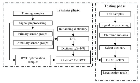 The proposed positioning method has two phases, i.e., training and testing. A flow chart of the entire positioning method is shown in Figure 9.