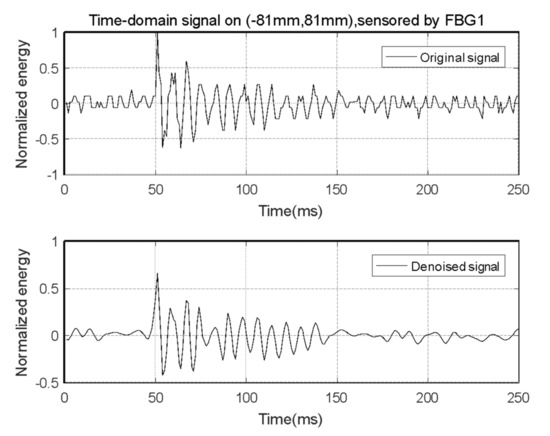 The response signal measured by an FBG sensor is processed by a wavelet transform denoise technique with the sqtwolog-threshold method using three-layer Daubechies-8 (DB8) wavelet decomposition as the noise reduction algorithm [25]. The noise–reduction effect is shown in Figure 10.