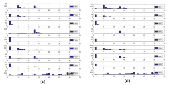 Wavelet packet energy spectrum of repeated impacts at (−81 mm, 81 mm): (a) first impact; (b) second impact; (c) third impact; (d) fourth impact.