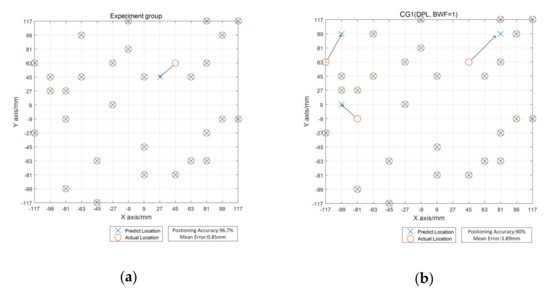 - CG1 involved DPL with . In this group, the positioning algorithm model degenerated to the original DPL. The measurement area was not divided, and all the sensors had the same weight in the classifier.