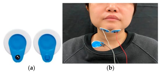 sEMG of the submental muscles was conducted by adhering a pair of bipolar electrodes (BIOPAC systems Inc., Goleta, CA, USA; Figure 2a) to both sides of the face at the submental muscles (Figure 2b). The skin over the muscles was cleaned before the attachment of the electrodes. The bipolar electrodes detected the electric potential generated by the muscles when they were neurologically activated for swallowing. The sEMG signal was amplified by a factor of 1000 and sampled at a 1-KHz sample rate. The data were transmitted through a wireless electromyogram transmitter (BIOPAC systems Inc., Goleta, CA, USA). A filter limiting the bandwidth to 5.0–500 Hz was applied to the collected data.