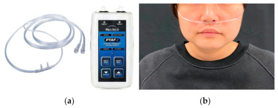 A nasal airflow cannula (Salter Labs De Mexico S.A. de C.V, Chihuahua, Mexico; Figure 3a) was placed in front of the nasal cavity for respiration sensing (Figure 3b). It was connected to a pressure transducer (Pro-Tech Services, Murrysville, PA, USA) to detect exhalation and inhalation. The pressure of the nasal airflow was translated into digital signals by the pressure transducer through the cannula.