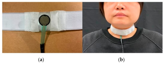 A force-sensing resistor (FSR) is a type of piezoresistive sensor that is used to measure the force applied to a surface (Figure 4a). The FSR is fixed on the center of a belt and the subject can wear the belt around the neck (Figure 4b). The belt has good elasticity and the velcro strap is used to close it. The maximal width of the belt is 5 cm, therefore it does not obstruct the natural swallowing motions. With this belt, the FSR can be mounted on the surface of the thyroid cartilage without any movement during the testing. The belt provided stable initial pressure on the FSR as the measurement baseline. The thyroid cartilage retracts up during each swallowing movement and returns to its original position after swallowing; these movements caused the pressure on the FSR to change.