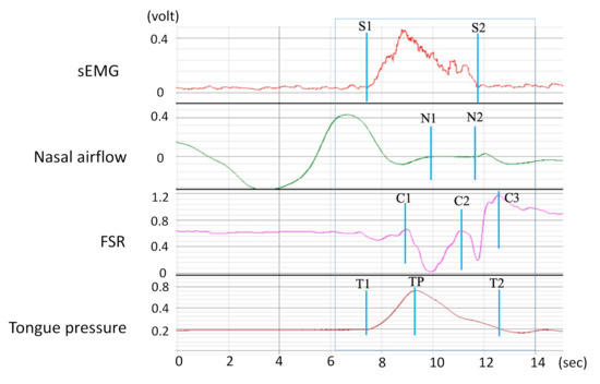 Practitioners tend to prefer swallowing assessments that employ noninvasive sensors, resulting in a test that is more convenient, safe, and free of radiation. Li et al. [15,16] evaluated biomedical coordination during oropharyngeal swallowing by using a noninvasive sensing system consisting of a tongue pressure sensor sheet between the tongue and hard palate, surface electromyography (sEMG) electrodes on the surface of the submental muscles, and a bend sensor with a microphone on the throat. These researchers synchronized all data to identify the temporal coordination among those structures. Their studies, however, only addressed healthy male participants. Furthermore, they only examined the correlation of muscle activity with tongue pressure during swallowing, thus lacking an analysis of the correlation of tongue pressure with nasal or oropharyngeal parameters. Murakami et al. [7] investigated the correlations between tongue pressure, hyoid movement, and suprahyoid muscle activity. They proposed a T-shaped sensor sheet to measure tongue pressure with sEMG and VFSS. Their study, however, only addressed the oral strategies (e.g., how to squeeze the gels) but not the swallowing path. Other related studies [17,18,19] have used multisensors to investigate the coordination between swallowing and respiration, but they have not considered tongue pressure. Since tongue and pharyngeal organs play crucial roles in bolus propulsion, understanding disorder of the individual organs involved in oral cavity and pharyngeal swallowing is not enough to ascertain the condition of swallowing impairment. It is necessary to explore the time-based correlation of the movements among the various organs.