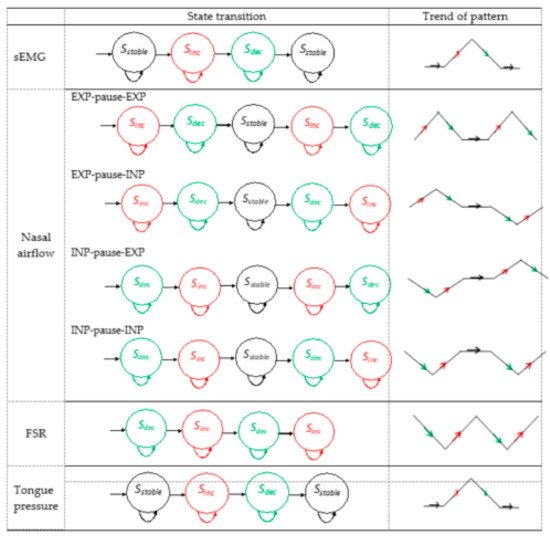 Figure 6 summarizes the normal state transition patterns of sEMG, nasal airflow, FSR, and tongue pressure signals. For tongue pressure and sEMG, the waveform rose from a baseline to a peak point. After the peak point, it declined and returned to the baseline. Thus, the state transition patterns of both signals follow the same pattern: they begin from Sstable and progress to a sequence of Sinc; this is followed by a sequence of Sdec and then a return to Sstable. For FSR, the waveform presented a W shape. Thus, the state transition patterns first declined, then rose, and subsequently repeated the same transitions one more time. For nasal airflow, two possible respiratory phases were observed before and after the respiration pause: expiration (EXP) and inspiration (INP). Thus, four respiratory patterns may be encountered: EXP-pause-EXP, EXP-pause-INP, INP-pause-EXP, and INP-pause-INP. Only EXP-pause-EXP is considered a physiologically safe swallowing type [19].