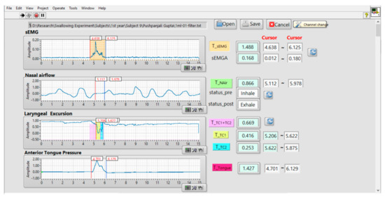 An autodetection program was implemented according to the method described in the preceding section. Figure 8 depicts a snapshot of the program. The four waveforms from the sEMG, nasal airflow, FSR, and tongue pressure are synchronized and displayed on the left side of the window. On the right side, the positions of each event, as well as the parameters defined in Table 2, are calculated and displayed. This program helps physicians perform the swallowing assessment in real time, and the results of all parameters can be exported for further statistical analysis. To help physicians to identify the time of each event on the waveform, a cursor function was incorporated into the program (see Figure 8). The physician can move the cursor position along the waveform to manually adjust the start and end points of each onset duration. The durations between the start and the end points are also displayed on the right side of the window in Figure 8.