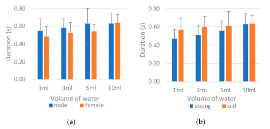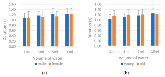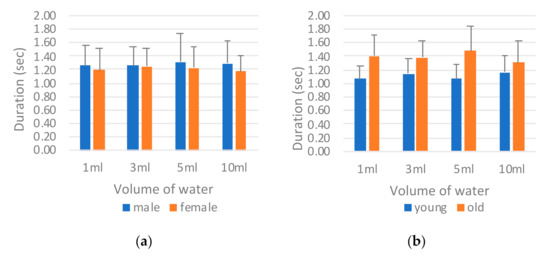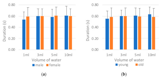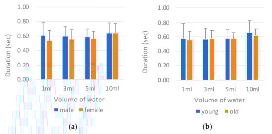 Figure 11 illustrates the total excursion time of the thyroid cartilage movement for each volume of water by sex and age. A clear difference was observed between the male and female participants swallowing 3 mL and 5 mL of water, and the female participants had a shorter total excursion time (Figure 11a). For the 1 mL and 10 mL volumes, the male and female participants required approximately equal time to swallow the water. By contrast, in terms of age, those in the old group spent more time on the 1 mL, 3 mL, and 5 mL tests on average than did those in the young group (Figure 11b). Only in the 10 mL test did the young group spend slightly longer swallowing than did the old group. Table 7 reports the ANOVA results for each factor. Sex, age, and water volume had a major effect on the total excursion time, but these factors had no interaction effects.