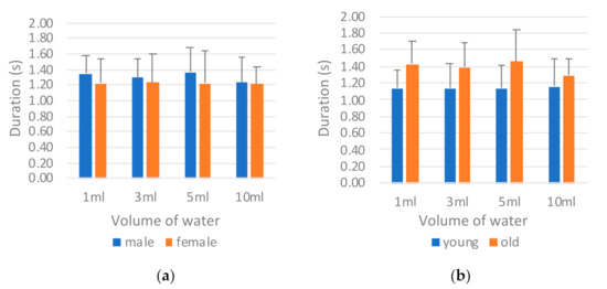 Figure 14 presents a comparison of the results of the tongue pressure onset duration (Ttongue) by sex and age. The male participants on average required an evidently longer onset duration than the female participants did in all tests (Figure 14a). This finding indicates that the male participants required more time to swallow the water during the oral stage. The same result was noted among those in the old group (Figure 14b). Those in the old group exhibited an even longer tongue pressure onset time than did the young group for safe swallowing. The ANOVA results in Table 10 support this result; significant differences were observed between the sexes and between the age groups. For different water volumes, however, significant differences were not observed between the sexes or between the age groups.