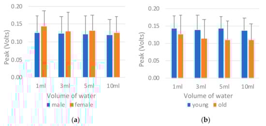 Figure 9 reveals the comparison of the sEMG onset time (TsEMG) by sex and age. The male participants exhibited a slightly longer TsEMG than did the female participants (Figure 9a). By contrast, a marked difference was observed between the young and old groups for all volumes of water, with the participants in the old group having a longer TsEMG on average (Figure 9b). The longer sEMG onset time indicated that the participants spent more time in the oral stage pushing the water backward to the larynx. ANOVA was used to evaluate which factor (i.e., sex, age, or water volume) had a main effect on TsEMG (Table 5). For each single factor, only age presented an obvious difference (i.e., p = 0.047), whereas the other two factors did not. Further evaluation of the interaction effects between different combinations of two factors confirmed that the age factor affected sEMG performance with different volumes of water (i.e., p = 0.007 for Age*Volume), whereas the sex factor did not. This finding indicates that age has a more critical effect on swallowing behavior than do the other factors, according to the sEMG measurement.