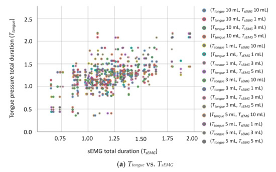 Table 12 illustrates the comparison results of tongue pressure onset duration with other parameters. The results revealed a strong positive correlation between the tongue pressure onset duration (Ttongue) and the sEMG duration (TsEMG), with r values ranging from 0.532 to 0.717. Regarding the ANOVA, the p values between Ttongue and TsEMG were smaller than 0.01 in all tests, confirming the strong positive correlation. However, Pearson’s test revealed no obvious correlation between the tongue pressure onset duration (Ttongue) and nasal airflow pause duration (TNAir) or thyroid cartilage excursion duration (TTC1 + TC2) parameters (Table 12). Figure 16 displays the grouped scatter plots of the parameter Ttongue with the other three parameters (i.e., TsEMG, TNAir, and TTC1+TC2).