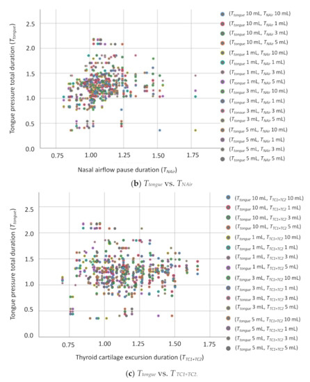 Figure 16. Grouped scatter plots of the parameter Ttongue with TsEMG, TNAir, and TTC1+TC2: (a) Ttongue vs. TsEMG, (b) Ttongue vs. TNAir, (c) Ttongue vs. T TC1+TC2.