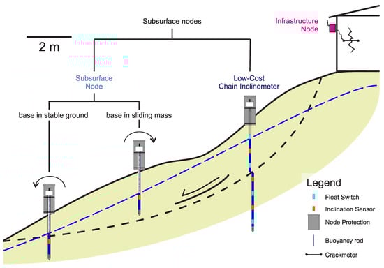Measurement concept for the Infrastructure node (IN), Subsurface Node (SN) and Low-Cost Chain Inclinometer (LCI).