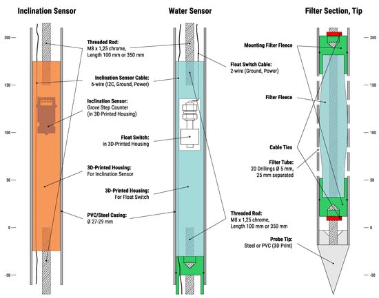 The SN and LCI are both subsurface attachments to the base module. After they are installed in the subsurface on site, the base module can simply be installed on top of the housing with a simple 3D-printed adapter (see Section 6). Inside the rod of the SN, one inclination sensor is included to be able to detect tilting of the rod. The casing of the rod can be made of PVC or stainless steel, but steel casings are preferable since they can be installed without pre-drilling. The detailed sensor- and connection-layout is shown in Figure 4.