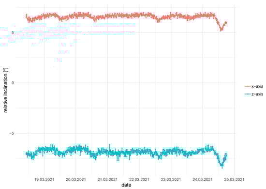 Exemplary inclination data taken from an accelerometer on top of a subsurface node. While the measurements do not yet show deformations, daily cycles as well as sensor noise are visible. The sensor noise in this real-world application is higher than that measured in the laboratory.