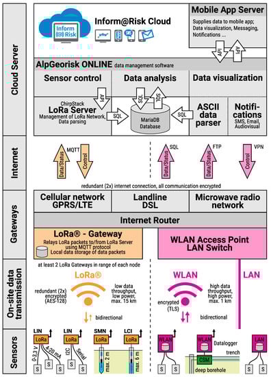 In case of the LoRa geosensor network the encrypted data packets sent from the nodes are relayed through the LoRa gateways on site to an off-site LoRa Network Server server using a redundant internet connection via DSL, Cellular network and/or microwave radio (Figure 8). The LoRa server manages the LoRa communication and relays the data to the LoRa application server, which then analyses and decodes the encrpypted data packets and writes the data into the Inform@Risk cloud database. The LoRa server is also responsible for sending control commands to the LoRa nodes via the most appropriate gateway. For the inform@risk project the open-source LoRa network server “Chirpstack” (www.chirpstack.io) (accessed on 1 March 2021) is used.