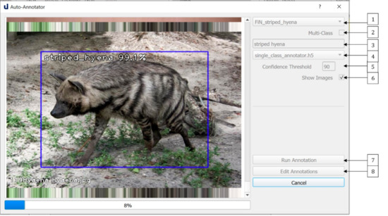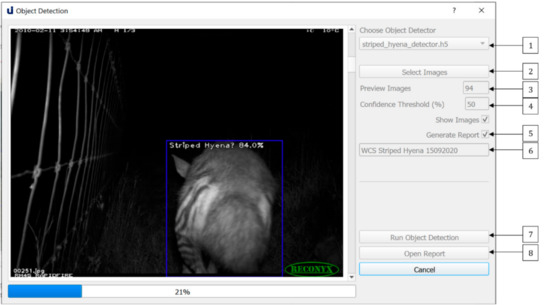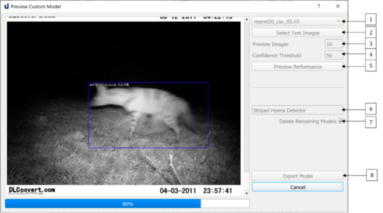 Once training is complete, the user can choose which snapshot they wish to retain as their final custom model. They can preview the performance of snapshots via the Preview Custom Model dialogue shown in Figure 8. They can choose snapshots via the dropdown list at (1), select their test images (2) and the number of images they wish to preview (3) as well as a level of accuracy (4). Once they run the model (5), they may name their model (6) and it (8). It is recommended that users delete all other models (7) as snapshots are large files. The exported model will be saved, to be reused via the Object Detection dialogue for object detection on any dataset, as described in Section 4.