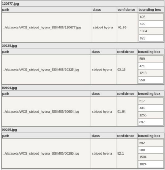 A sample of the detailed report, which shows per image data, including class label, classification confidence and bounding box data for each object. This preview is generated using json2table.com.