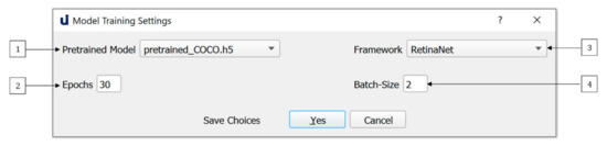 U-Infuse features default training parameters established within our research program. They can be modified via the Model Training Settings Dialogue shown in Figure 6. Firstly, the user must select a pretrained model (1). U-Infuse provides 6 pretrained models, one of which can be selected as the backbone for further model training. User provided or trained models can also be used as the basis for further model training, if placed in the ./pretrained_models directory. Training time will not be significantly affected by the user’s selection of pretrained models. Pretrained models should be chosen based on the user’s target species. For example, if they wish to create a vehicle detector, they should choose the pretrained_COCO model as their backbone, as it has been trained on cars and trucks already, so it will have learned some of the relevant features. Similarly, if the user wishes to create a macropod detector, they should choose the Australian_Multi-class pretrained model as their backbone, as it was trained on 30 Australian species, including wallabies and kangaroos.