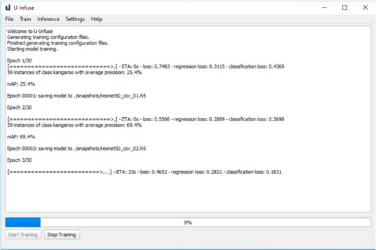 For best user experience, practitioners are encouraged to use the downloadable executable file for installation, on a Windows 10 system. The simple-to-use GUI allows users to auto-annotate training images, custom train their own object detectors using RetinaNet [32], and perform inference using pretrained or custom models on custom datasets. GUI Performance has been verified for large datasets, containing approximately 10,000 s of images. U-Infuse is available online at GitHub (https://github.com/u-infuse/u-infuse, accessed on 1 April 2021). All U-Infuse functionalities are also provided via Python scripts and Jupyter Notebooks, which contain the U-Infuse pipeline that can be used as is, incorporated into, or adapted to any project on any platform. Whilst the GUI is appropriate for workstations processing thousands of images, the Jupyter Notebooks allow the U-Infuse functionalities to be extended to datasets of any size, on high performance computing systems. All upgrades, demonstrations and tutorials are available on the corresponding GitHub Wiki.