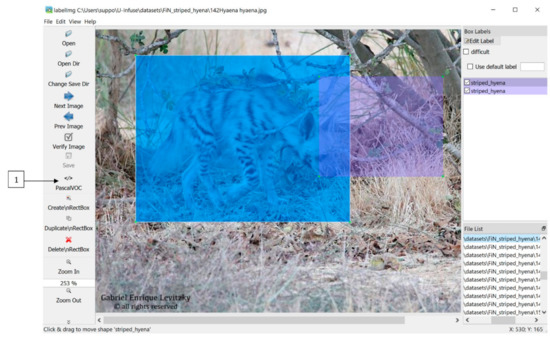 Bounding boxes can be added, removed or resized, and labels can be changed within the labelImg GUI as shown in Figure 10 Users must ensure they save any altered annotations in Pascal VOC format by selecting the option denoted by (1) in Figure 10. Once this process is completed, the images and corresponding annotation files can be used to train models, as described in Section 5.