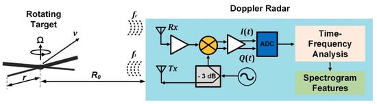 Assuming that a simple homodyne Doppler radar illuminates a structure comprised of rotating blades, as seen is Figure 1, the reflected signal is phase-modulated by their movement. The returned echoes are mixed with the same transmitted signal by a quadrature-mixer to generate in-phase (I(t)) and quadrature-phase (Q(t)) baseband responses. The analytic form of the amplitude-normalized baseband signal can be cast as sb(t) = I(t) + jQ(t) = , where the time-varying distances between the radar sensor and each of the K scatterers are and K is the number of scatterers. Taking into account that the blade’s surface backscatters significant radar signals in the perpendicular direction, the distance between each scatterer and the radar makes the total received signals be coherently added. Therefore, its micro-Doppler signatures will have the form of flashes in the time-Doppler maps [28].