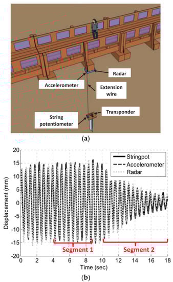 To solve the problem of the low SNR of baseband responses for longer monitoring range, the use of active transponders as reference points was considered to track the vibration measurements of a bridge [62,63]. In [64], full-scale tests were conducted on a 50-m long bridge at the O’Leno State Park, Florida, USA, as is revealed in Figure 3a. The employment of active backscattering configuration allows the increment of the received backscattered RF power or the change on the frequencies of the received signals. It also significantly reduced the influence of undesired surrounding clutter. Moreover, the use of high-directivity, bulky antennas became unnecessary, and the radars operating in the active backscattering mode can also be an alternative for the SHM of bridges with high clearance or be employed in scenarios with moving targets under the bridge such cars, boats or water flow. After various laboratory experiments demonstrated the improved performance of the active transponder configuration, a full-scale test was conducted to validate the proposed approach. The radar displacements were compared with the measurements obtained from a string potentiometer and an accelerometer. A transponder was placed on the ground 2.48 m below the radar. The vibration measurements were forced by a person jumping close to the quarter span with a frequency approximately equal to the first natural frequency of the bridge. Although the radar operation on the passive backscattering mode was not able to retrieve accurate measurement responses, the active backscattering mode for the SHM based on Doppler radar was successfully demonstrated. However, as the motion amplitude of the bridge decreased to less than 2 mm, the accuracy on the radar measurements deteriorated, as shown in Figure 3b (segment 2).