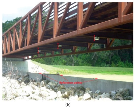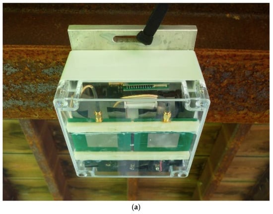 Experimental setup for the SHM of a bridge done by a Doppler radar sensor network: (a) Doppler radar mounted on plastic enclosure; (b) Doppler radar network deployed. Reprinted with permission from ref. [69]. Copyright 2018 American Society of Civil Engineers.