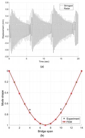 Experimental results for the Doppler radar sensor network operating in the active mode: (a) displacement measured at the midspan; (b) shape of the first mode. Reprinted with permission from ref. [69]. Copyright 2018 American Society of Civil Engineers.