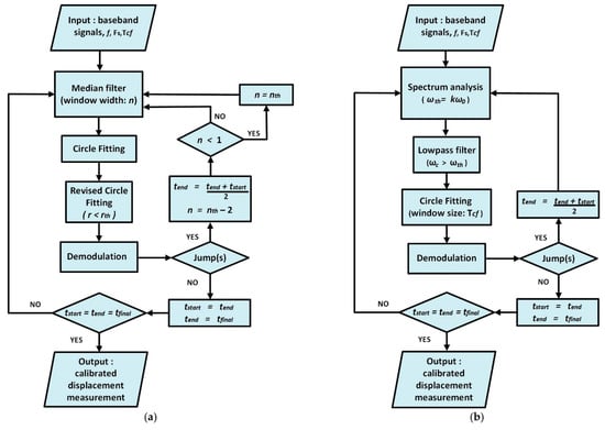 Flowchart for the propose adaptive displacement calibration strategies: (a) adaptive joint signal processing algorithm; (b) adaptive lowpass filtering algorithm. Reprinted with permission from ref. [71]. Copyright 2020 IEEE.