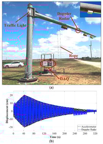 Experimental results for the field SHM of a traffic light structure: (a) experimental setup with the radar enclosure shown in the inset; (b) demodulated displacement using only arctangent demodulation. Reprinted with permission from ref. [71]. Copyright 2020 IEEE.