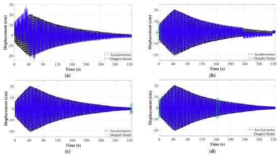 Figure 8 depicts the experimental setup and the displacement obtained after the use of the conventional arctangent demodulation algorithm on one of the recorded data sets. Jumps are clearly seen around instants 240 s and 320 s. The manual versions of the AJSPA and the ALFA were also implemented in MATLAB and applied to the recorded data set shown in Figure 8b. Figure 9a,b illustrate the displacement measurement obtained through the non-adaptive JSPA and the non-adaptive lowpass filtering technique, respectively. The accelerometer measurements are compared with the radar responses. Discontinuities and jumps are observed in both demodulated data, which demonstrates that the non-adaptive strategies are not robust for practical SHM applications. The reason the non-adaptive JSPA fails in providing accurate displacements is because it keeps the window size of the median filter constant, which causes severe attenuation on high-frequency components particularly when the amplitude motion is considerably large. The non-adaptive lowpass filtering strategy is ineffective because, as the motion amplitude continuously changes, the number of significant harmonics also changes, while the cutoff frequency of the lowpass filter is fixed. Thus, it does not account for amplitude motion variations. In contrast, Figure 9c,d reveal the radar displacements after applying the AJSPA and the ALFA, respectively. The sudden bounces are completely removed from the demodulated Doppler radar data since both approaches modify its key parameters as the amplitude motion changes. However, although the radar measurements were in good agreement with the ground truth, when the SNR deteriorates, the AJSPA produced distortions as seen in Figure 9c. Likewise, discontinuities caused by the process of cutting apart displacement with abrupt jumps are highlighted in Figure 9d. The RMS error for the AJSPA response was 0.445 cm and the RMS error between the ALFA measurement and the reference was 0.465 cm. The authors also analyzed the proposed algorithms regarding their accuracy and computational demand for other seven recorded data sets. Both calibration strategies provided sub centimeter measurement accuracy. During the computational complexity analysis, ALFA performances presented higher latencies than the AJSPA performances since the latter has an embedded spectral analysis subroutine. The proposed adaptive calibration strategies are capable to handle the issue of introduced sudden jumps and can be used for the data demodulation of long-term baseband signals. However, without the presence of active transponders or nonlinear tags, clutter and moving targets remained a challenge for accurate SHM based on Doppler radar operating in passive backscattering mode.