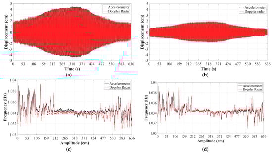 As already mentioned, the structural modal analysis is obtained from the synchronous multipoint vibration measurements. In this paper, cabled radar networks, which do not rely on batteries as DC power sources, are referred to as radar sensor arrays. By studying the changes on the vibration mode shape, another important parameter for the structural health diagnosis can be evaluated. Recently, researchers proposed a low-cost Doppler radar array operating in the passive backscattering mode for the SHM of a traffic light as illustrated in Figure 10 [72]. In the full-scale tests, forced vibrations demonstrated that the displacements at the tip and at the midspan could be simultaneously recovered with sub centimeter accuracy. The references were displacements estimated by twice numerical integration of the corresponding accelerometer measurements. A high-pass filter with a cut-off frequency of 0.5 Hz was applied to the processed data after each integration step. In contrast to most of the existing SHM works based on Doppler radars, structural response to environmental loads was also considered. The arrays were prepared to uninterruptedly monitor the traffic light for several days. Only the segments of raw data that produced displacements larger than ~1 cm at the tip and larger than ~0.5 cm at the midspan were successfully phase-demodulated. The amplitude motion significantly affects the SNR of the received RF signals [73]. Since jumps were seen at the arctangent demodulated data retrieved from the tip of the mast, the previously mentioned AJSPA was necessary to calibrate the radar measurements. Figure 11a,b show the wind-induced vibration measurements obtained at the tip and at the midspan, respectively. The RMS error for the displacement recovered at the tip was calculated as 0.282 cm. The error for the displacement measured at the midspan was 0.117 cm, which was smaller due to the introduced distortions by the filtering approaches embedded in the AJSPA. Fourier-based analysis and structural modal evaluations obtained through proper orthogonal decomposition algorithms are not able to capture the non-stationary fluctuations caused by environmental vibrations because these methods only deliver the average spectral decomposition of the signal [74,75]. On the other hand, multi-resolution strategies that rely on complex Morlet wavelet transforms can overcome these limitations [76,77,78,79]. Therefore, the authors estimated the evolution of the dominant vibration frequencies by identifying the frequencies associated with the maximum magnitude of the wavelet scalograms of the measurements obtained from Doppler radar and accelerometer displacement data at every instant. Figure 11c,d exhibit the plots for the instantaneous natural frequencies retrieved at the tip and the midspan, respectively. The variance on the dominant vibration frequencies is relatively higher for the smaller amplitude motion, and it turns lower when the amplitude of the mast movement increases. The RMS errors for the dominant frequencies estimated by the Doppler radar array were 0.0006 Hz for the measurements retrieved at the tip of the mast and 0.0003 Hz for the measurements recovered at the midspan. Again, the use of the AJSPA to calibrate the demodulated displacement at the tip affected the accuracy for the calculated dominant frequencies.