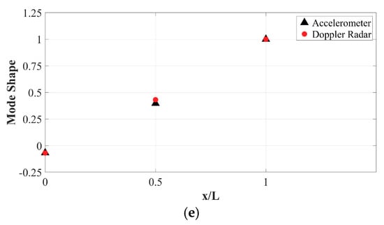 Experimental results: (a) demodulated displacement using the AJSPA retrieved at the tip of the mast; (b) demodulated displacement recovered at the midspan; (c) instantaneous dominant frequencies at the tip; (d) instantaneous dominant frequencies at the midspan; (e) first in-plane mode shape of the traffic light structure evaluated by the Doppler radar array and an accelerometer attached to the pole-arm connection [72].