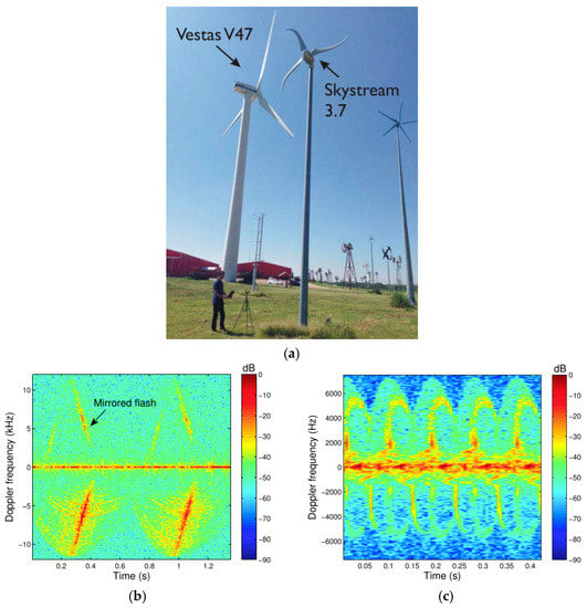 SHM of industrial wind turbines: (a) experimental scenario; (b) spectrogram for the Vestas V47 illuminated by a 24-GHz Doppler radar; (c) spectrogram for the Skystream 3.7 illuminated by a 24-GHz Doppler radar sensor. Reprinted with permission from ref. [28]. Copyright 2016 IEEE.