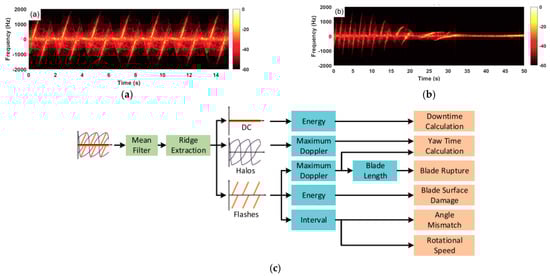 SHM of a onshore wind turbine: (a) spectrogram when the turbine is fully operational; (b) spectrogram when the blade rotation is gradually stopping; (c) flowchart of the proposed strategy for the SHM of a wind turbine. Reprinted with permission from ref. [94]. Copyright 2021 IEEE.